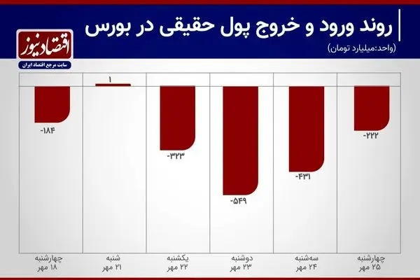 سهشنبه: 431 میلیارد تومان پول حقیقی از بازار خارج شد. ارزش کل معاملات بازار در این روز 30هزار و 440 میلیارد تومان بود که از این مبلغ 2هزار و 280 میلیارد تومان آن مربوط به معاملات خرد سهام و حق تقدم بود. از طرفی صندوقهای طلا با افت قیمت اما با ورود پول مواجه بودند، به این معنا که با افزایش ریسکها در بورس مردم صندوقهای طلا را به عنوان فرصتی برای سرمایهگذاری با ریسک کم میبینند.