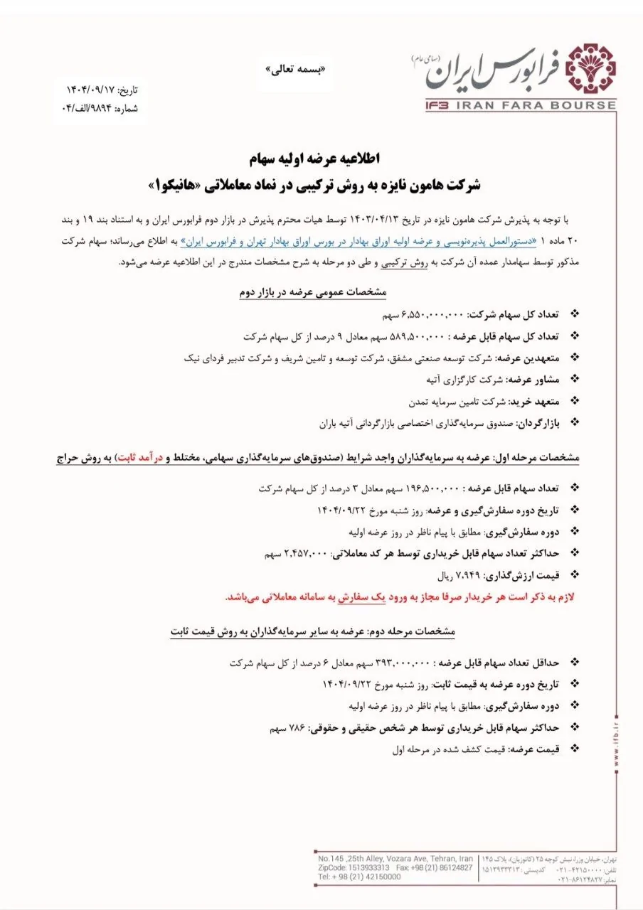 عرضه اولیه سهام شرکت هامون نایزه به روش ترکیبی در نماد معاملاتی «هانیکو1»