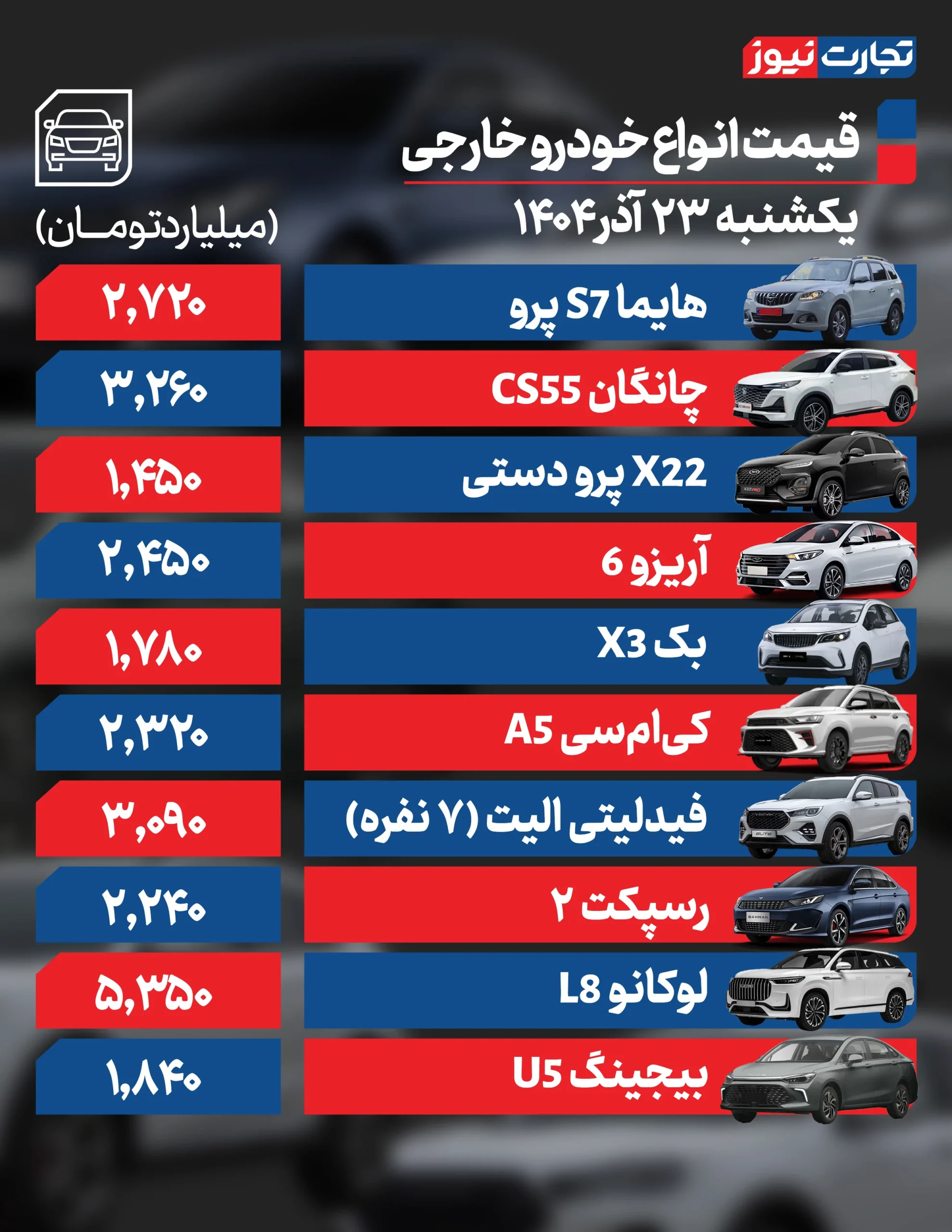 قیمت خودرو امروز 23 آذر 1404 از سوی بنگاههای معاملاتی اعلام شد.
